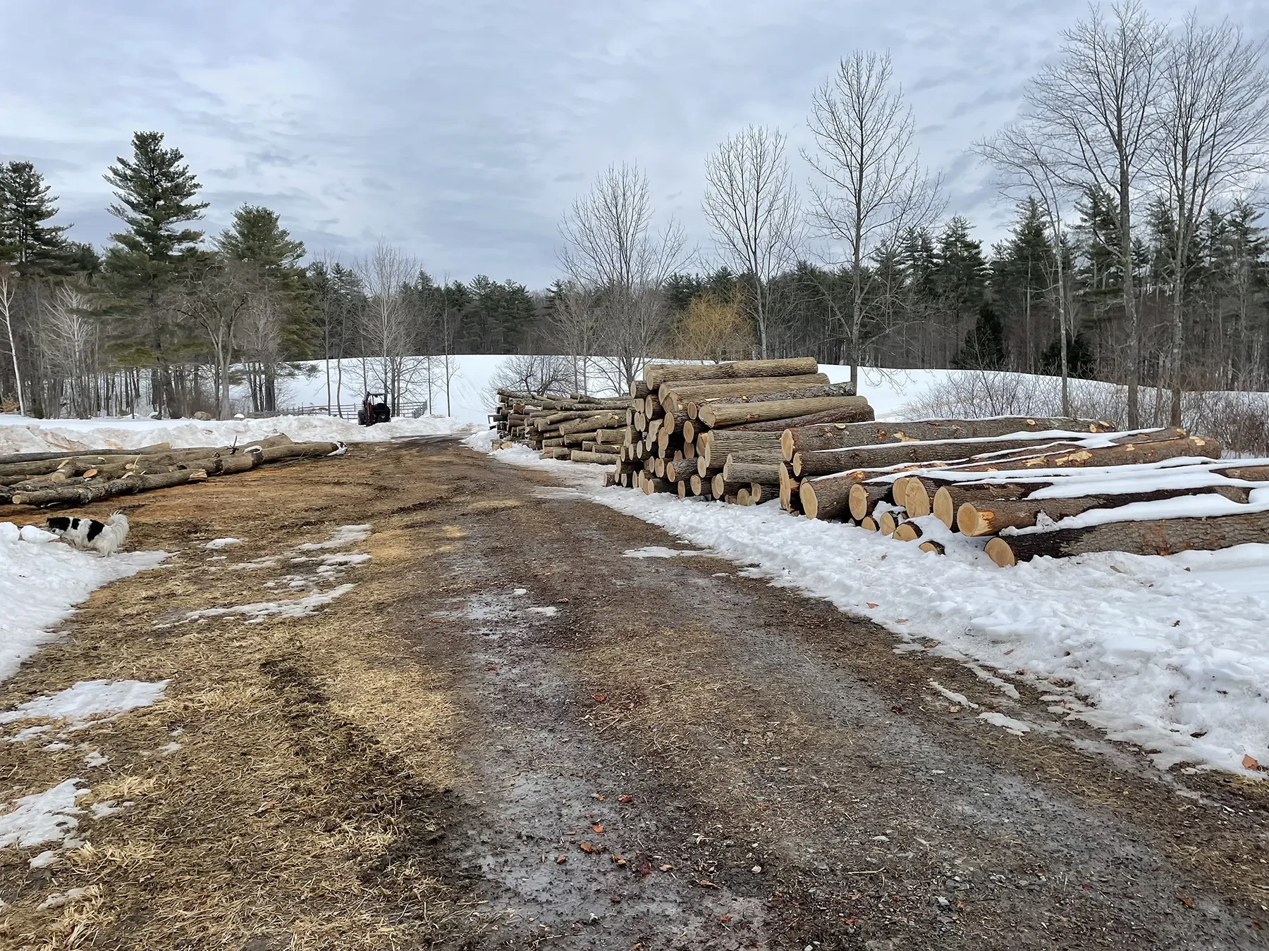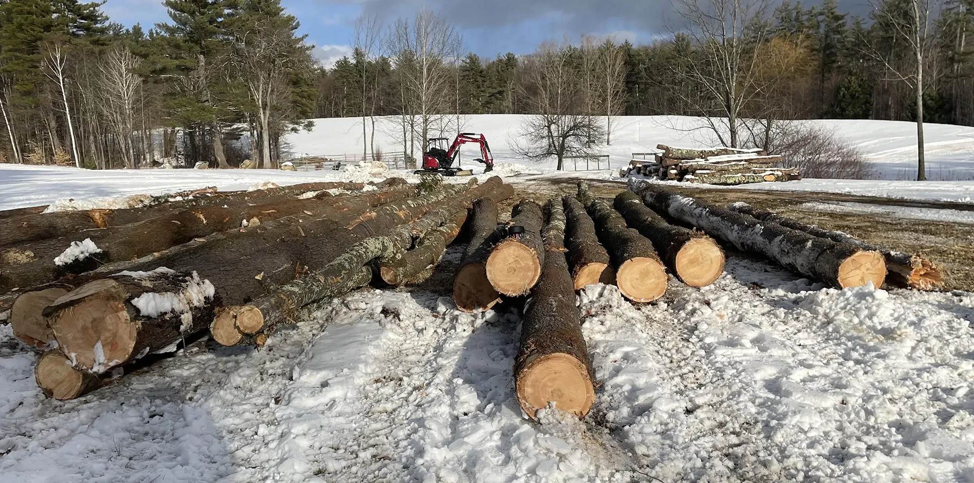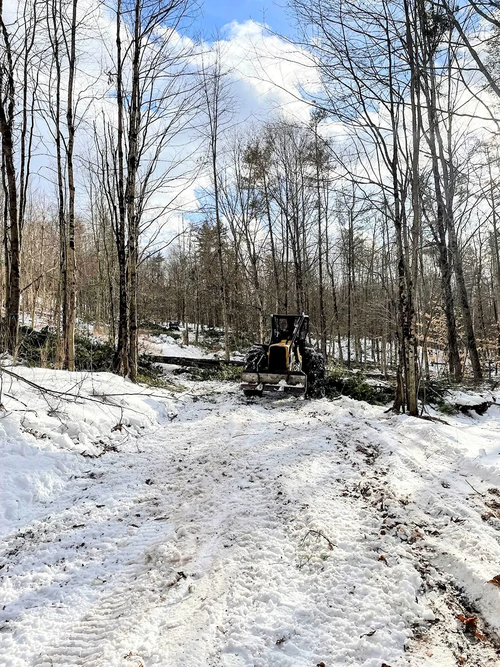 In February, we were able to begin a short ten-day operation ahead of a series of snowstorms. Our Forest Management Plan provided the guidelines for the TSI, including cutting trees within two feet of the ground or less, avoiding hauling and yarding when soil is too soft, cutting trees in a manner to prevent or minimize injury to unmarked trees, and leaving snags for wildlife when they are not a safety hazard. This also included returning existing roads and trails to equal or better condition prior to the start of the operation, removing all logging debris from the landing area, removing brook crossings and installing water bars when needed.