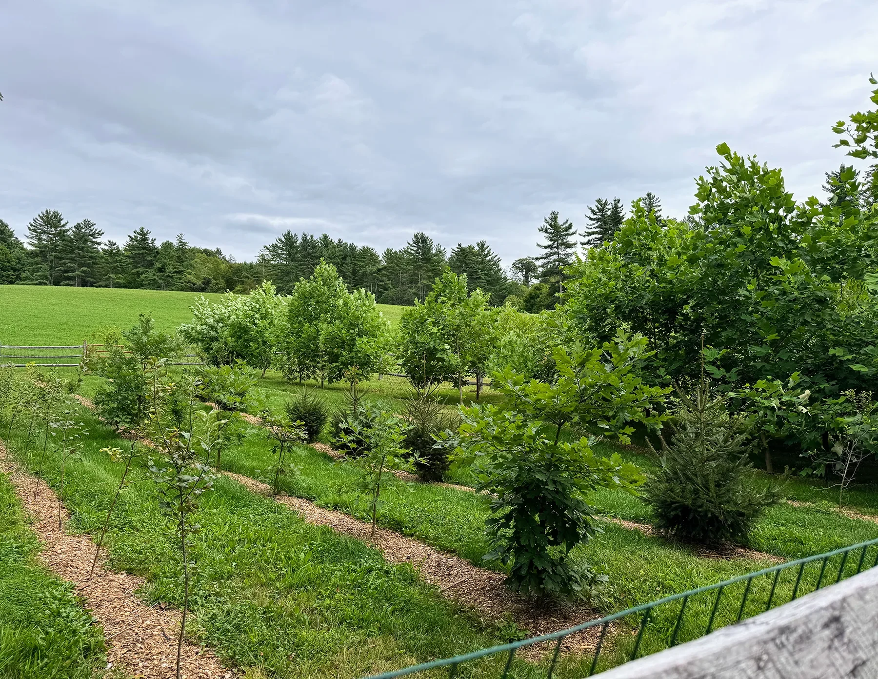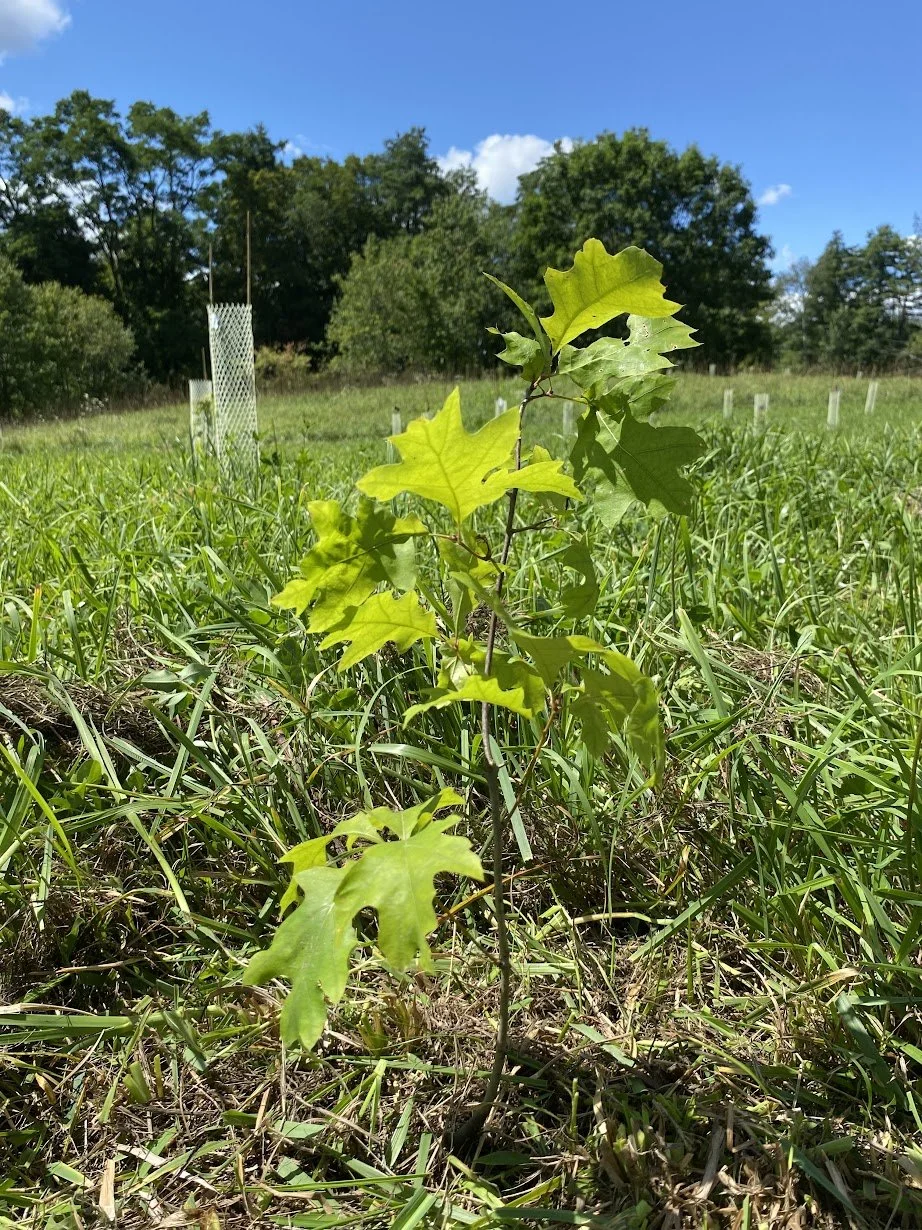 A large-scale native shrub and tree planting, organized by an Antioch grad student, was implemented in spring of 2023. Board members, Antioch students and friends gathered together to successfully plant 230 young whips, or saplings, each protected from deer browse with their own mesh sleeve. The plantings are located in the southern field, divided into 3 separate plots and along both sides of the seasonal stream.