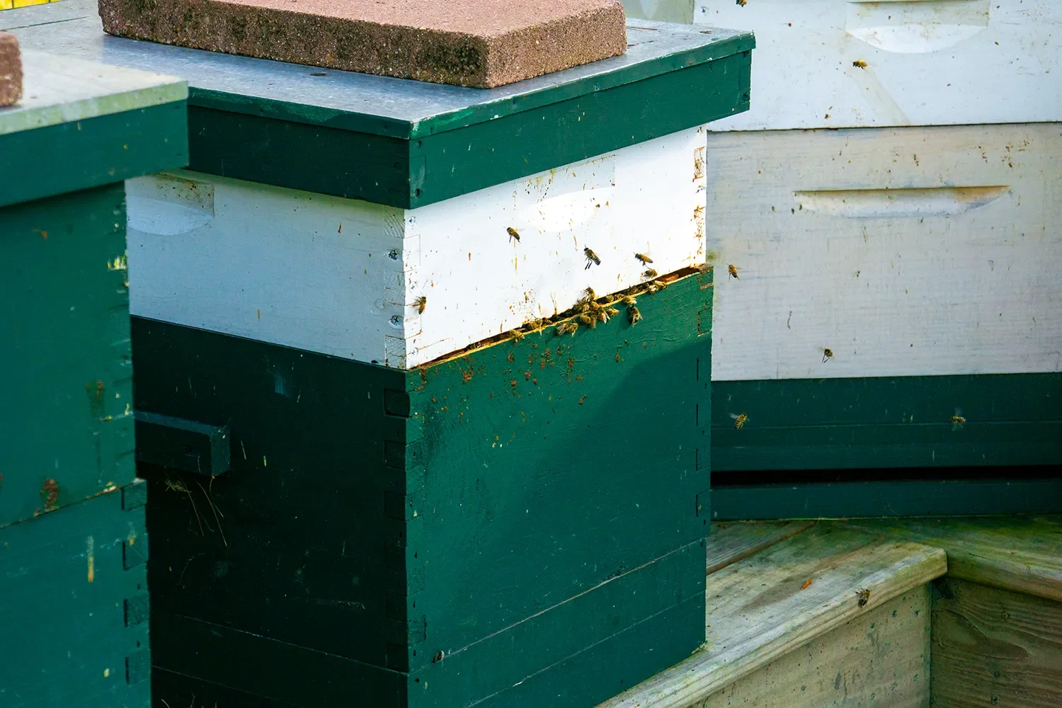 In June of 2019, a local beekeeper started keeping honey bees and hives in a small enclosure built by the pond. Each of the hives housed 30,000 - 60,000 bees. Unfortunately, a bear destroyed two of the hives in 2022. A new enclosure with higher fencing was built in a new full-sun location where a dozen new beehives were installed. Since then, the health of the bees has increased as well as survivorship.